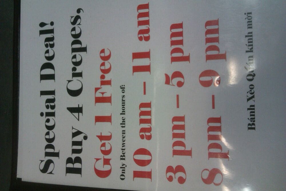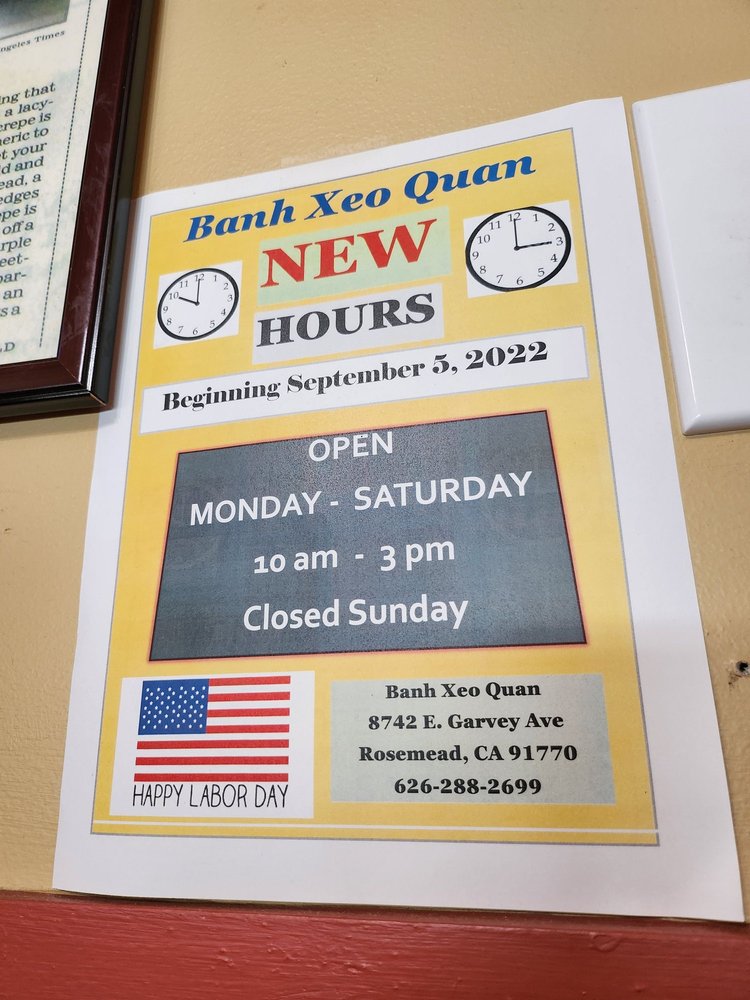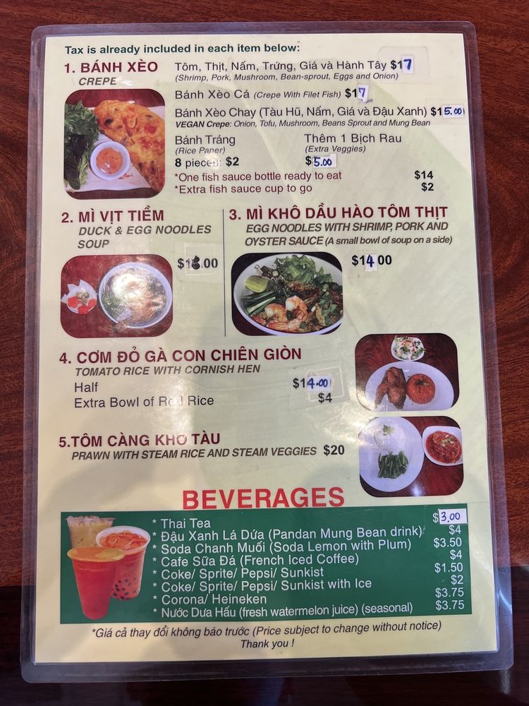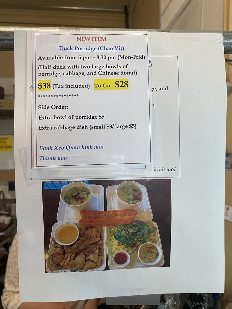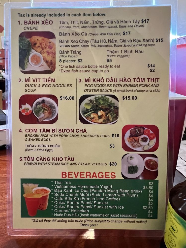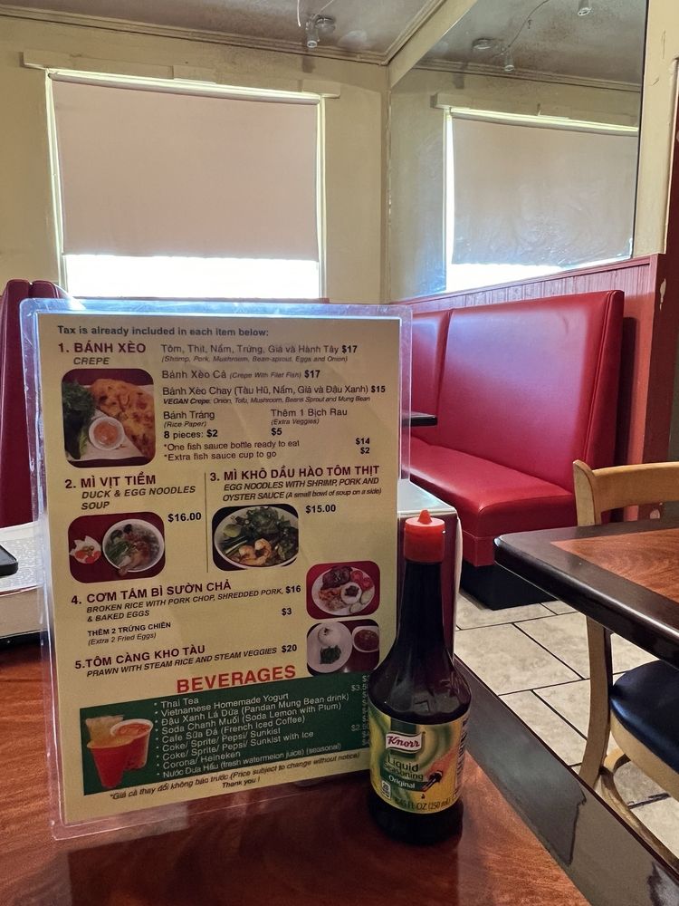 Introducing the menu at Bánh Xèo Quán, a Vietnamese gem located in Rosemead, CA. This cozy restaurant offers a variety of mouth-watering options, including their famous Banh Xeo, crispy and loaded with ingredients. Customers rave about the vegetarian Banh Xeo, served with rice paper for wrapping. Other must-try dishes include the duck noodle soup and the refreshing pandan mung bean drink. The attentive service and homey ambiance make dining here a delightful experience. With quick service and a limited but delectable menu, Bánh Xèo Quán is a go-to spot for authentic Vietnamese cuisine. Don't miss out on their Happy Hour specials and the option for takeout, perfect for enjoying their delicious dishes anywhere. Try Bánh Xèo Quán for a taste of Vietnam right in California.